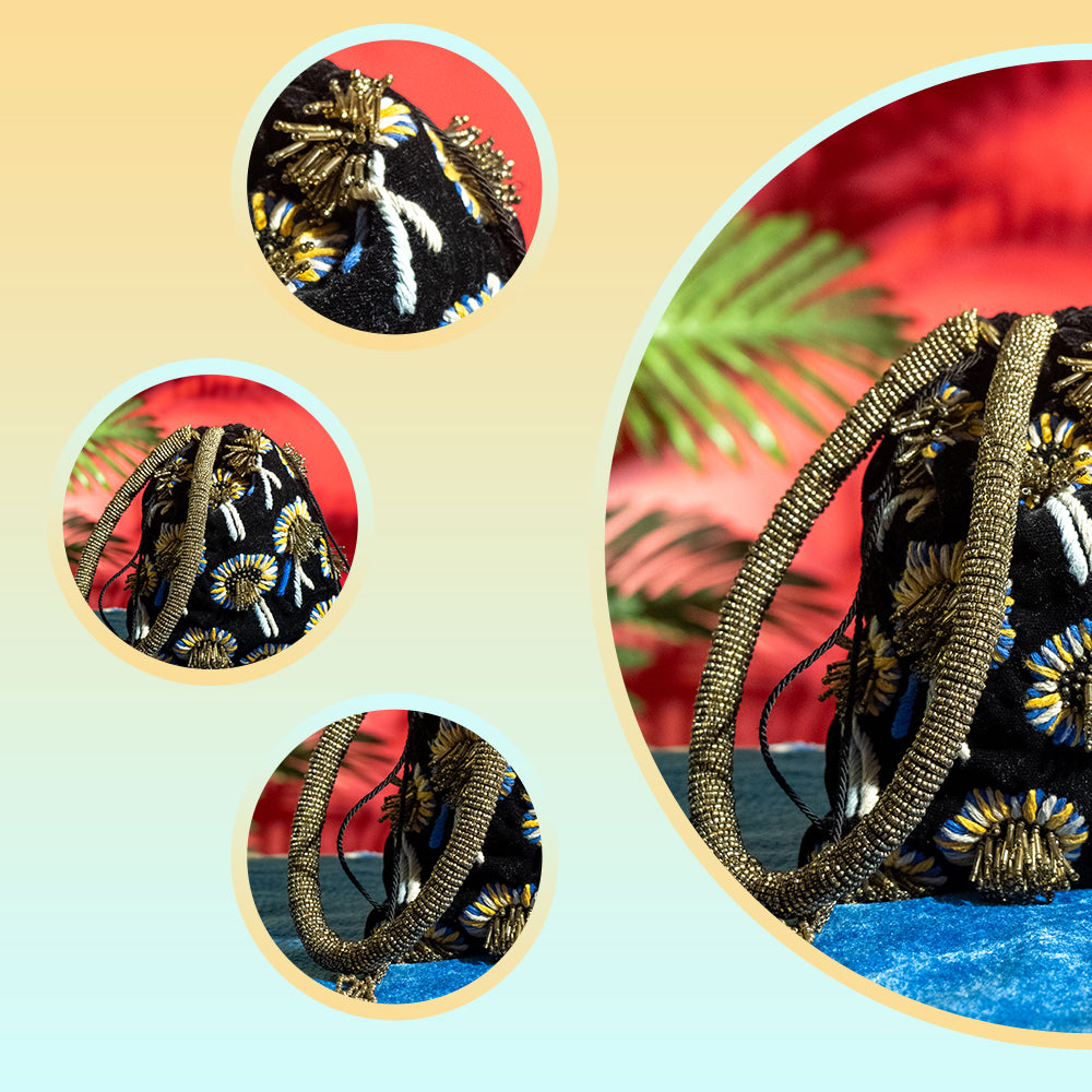 Handcrafted Floral Glass Nalki Bridal Bag – Velvet Satin Lining, Chain Strap, Perfect for Weddings