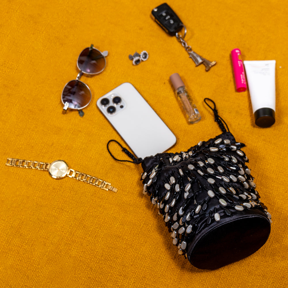 This elegant glass and acrylic beaded potli showcases hand-stitched artistry on poly velvet with satin lining. Featuring a fixed metal chain strap, it’s perfect for weddings, receptions, and parties.